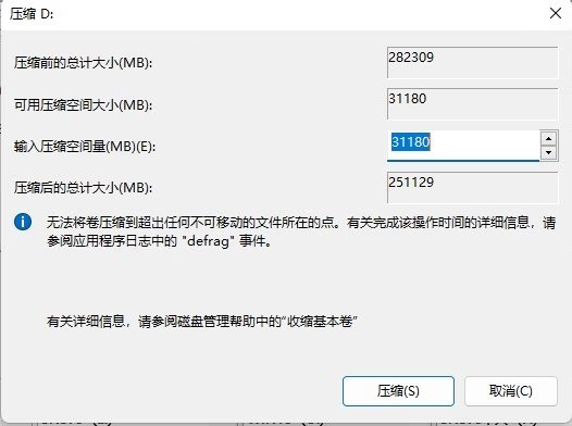 2、输入后你可以看到下方“压缩后的总计大小” 后面的数字就是C盘分后的剩余空间。随后点击压缩。